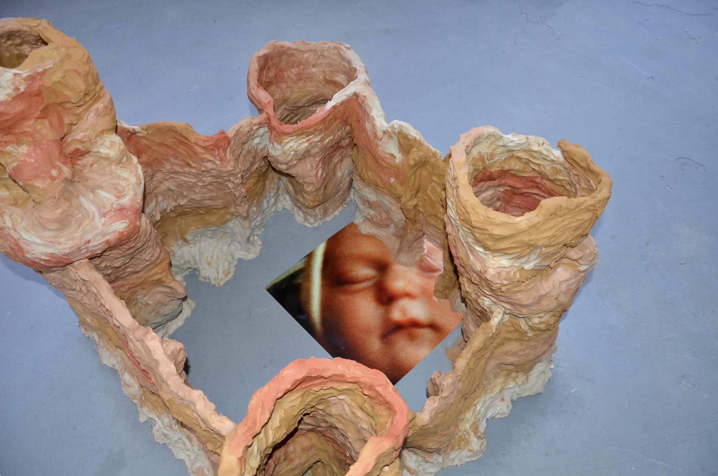 Wet clay, analogue selfportrait printed on glossy paper and hand-bound booklet.